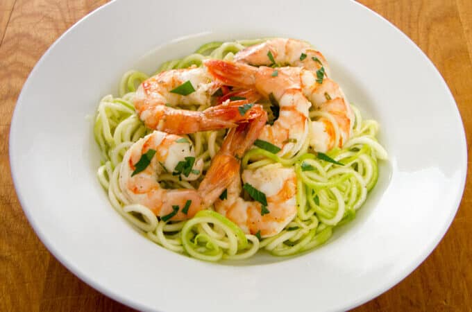 Juicy and flavorful shrimp perfectly complement this paleo pasta recipe, which isn't actually made from regular pasta but from zoodles, that is, zucchini noodles.